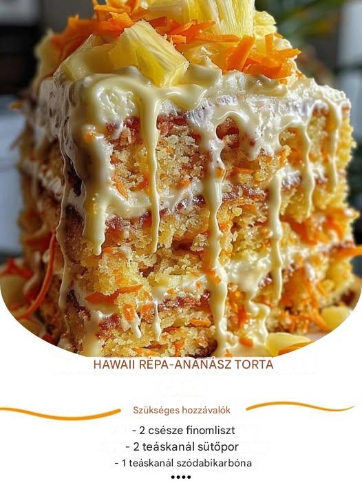 Hawaii répás-ananászos torta Hozzávalók a süteményhez : • 2 bögre finomliszt • 2 teáskanál sütőpor • 1 teáskanál szódabikarbóna • 1 teáskanál őrölt fahéj • ½ teáskanál só • 1½ bögre kristálycukor • 3 nagy tojás