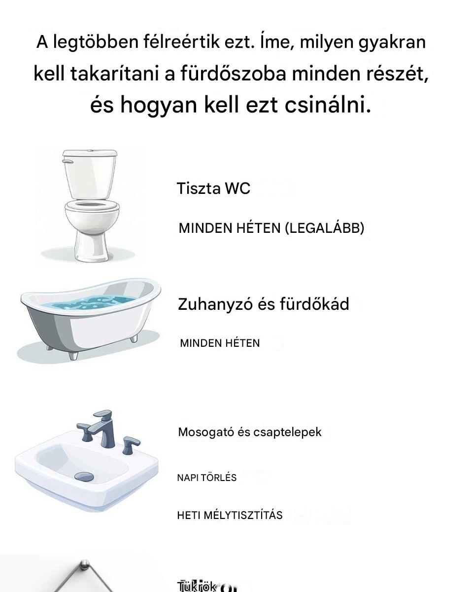 zuhanyzókat és fürdőkádakat hetente kell tisztítani a szappanlerakódás és a penészképződés megelőzése érdekében. Használjon nem súrolószert és súrolókefét a csempék és a fugák eltávolításához. Üvegajtók esetén ecet és víz keveréke segíthet a vízfoltok eltávolításában. Alaposan öblítse le és szárítsa meg a felületeket a vízfoltok és a penészképződés megelőzése érdekében.