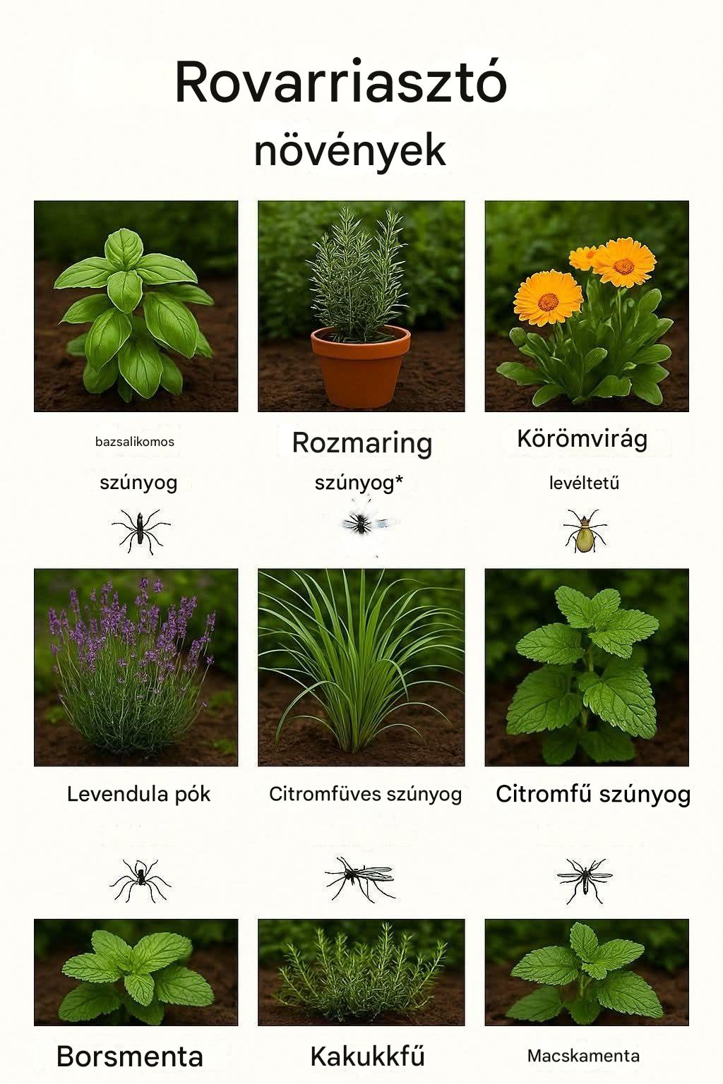 Levendula – Nyugtató illatával és gyönyörű lila virágaival a levendula elriasztja a szúnyogokat az illóolajainak köszönhetően, amelyek nem vonzóak számukra. Esztétikája és illata miatt is nagyszerű kiegészítője bármely kertnek. Körömvirág – A piretrumot tartalmazó körömvirág, amely egy gyakran előforduló összetevő a rovarriasztókban, természetes és dekoratív módot kínál a szúnyogok elriasztására. Ültesse őket cserepekbe, és helyezze otthona bejáratainak közelébe. Bazsalikom – Ez a gyógynövény nemcsak az ételeit dobja fel, hanem a szúnyogokat is riasztja. A bazsalikom olyan illatot áraszt, amelyet a szúnyogok különösen kellemetlennek találnak. Az olyan fajták, mint a citromos bazsalikom és a fahéjas bazsalikom, különösen hatékonyak.Macskamenta – Kutatások szerint a